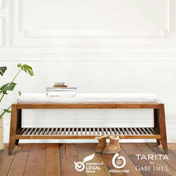 ベッドエンドベンチ無垢チーク材、取り外し可能なファブリッククッション、棚付きヴィンテージコンテンポラリースタイル